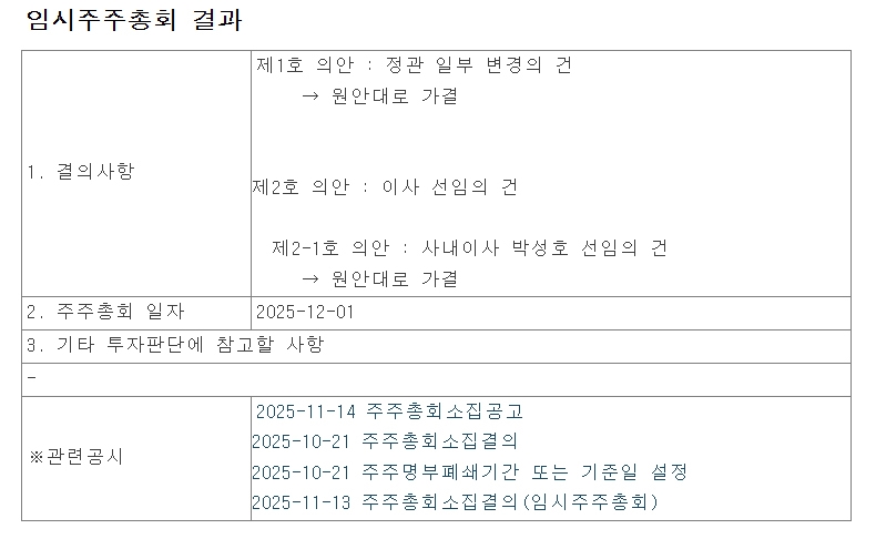 더트래커 = 박지훈 기자네오펙트가 지난 1일 열린 임시주주총회에서 사업 다각화와 관련된 주요 안건을 모두 원안대로 통과시켰다. 실적 반등의 중대한 신호탄이 될 전망이다. 이번 주총에서는 사업 목적 추가를 위한 정관 변경과 사내이사 선임 등 핵심 안건이 논의됐으며, 모든 안건이 수정 없이 가결됐다. 회사는 연말까지 수익 구