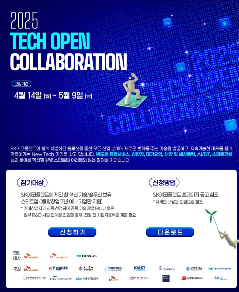 SK에코플랜트는 반도체·인공지능(AI) 분야 스타트업 혁신기술 발굴 및 육성을 위한 ‘테크 오픈 콜라보레이션’ 공모전을 개최한다고 14일 밝혔다.