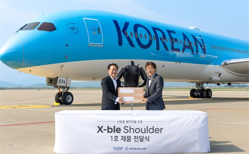 현대자동차·기아는 지난 8일 인천 중구에 위치한 대한항공 항공기 정비고에서 산업용 착용로봇 ‘엑스블 숄더’의 1호 전달식을 진행했다고 9일 밝혔다.