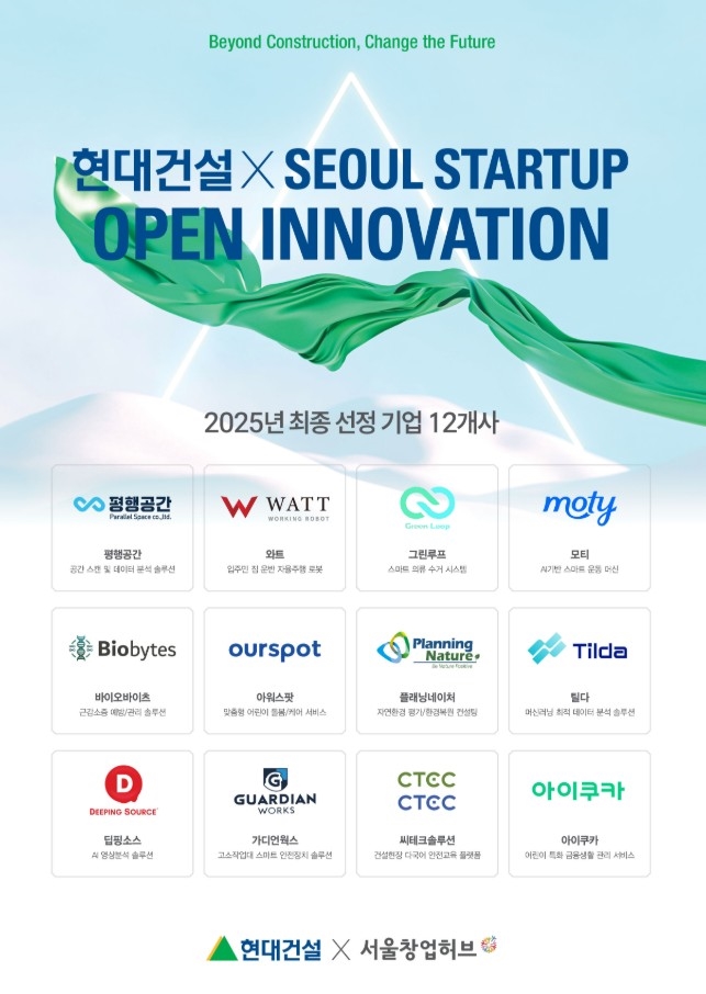 현대건설은 ‘2025 현대건설 x 서울 스타트업 오픈 이노베이션’ 공모전을 통해 혁신 기술을 보유한 12개 스타트업을 최종 선정했다고 10일 밝혔다.