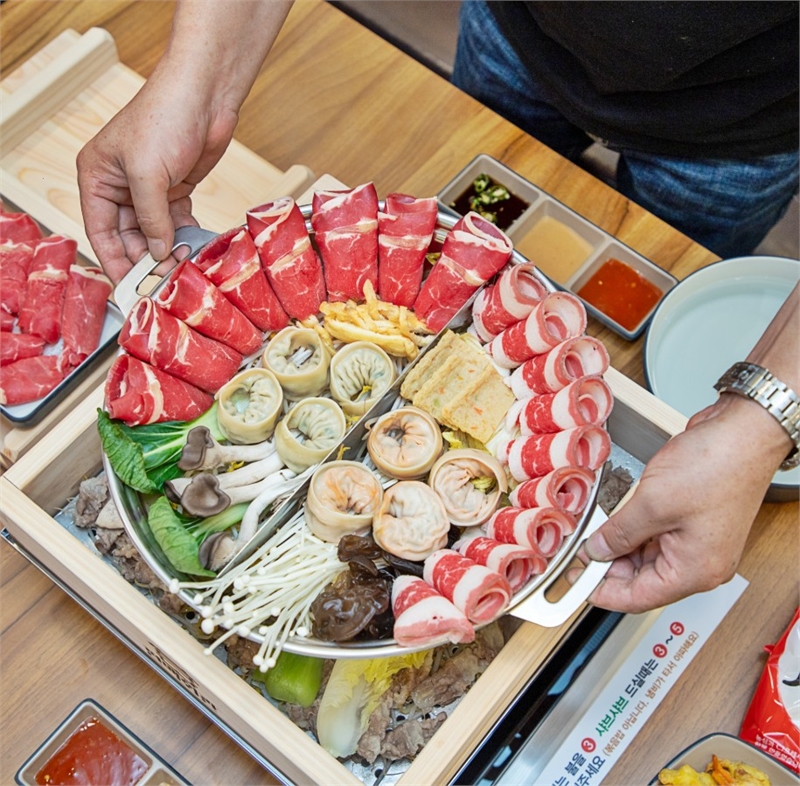 샤브샤브는 진한 감칠맛의 사골마라, 구수한 된장에 닭의 담백함이 어우러진 된장닭 등 5종의 육수와 특제 소스를 갖춰 취향에 맞춘 조리가 가능하다.