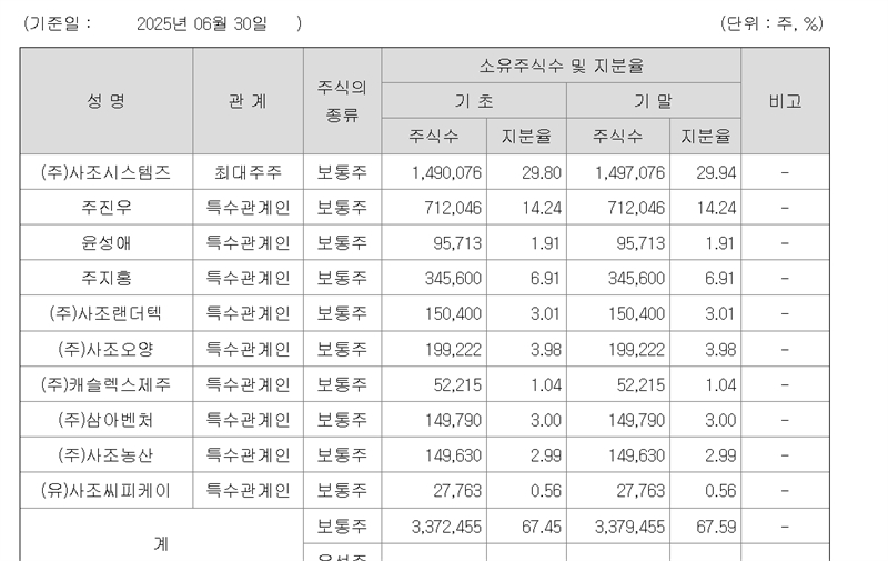 사조산업의 지난 6월말 기준 최대주주및 특수관계인 명단