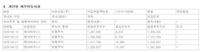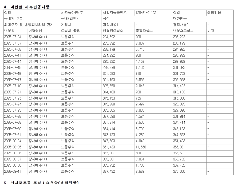 8월에도 사조대림 지분을 계속 사모은 사조산업관련 공시