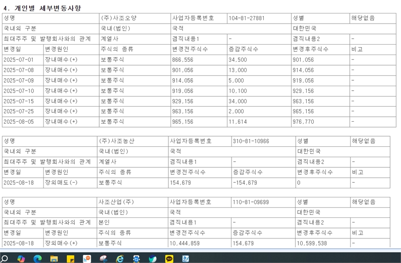 지난 7~8월 사조오양 지분을 계속 사모은 사조동아원 관련 공시