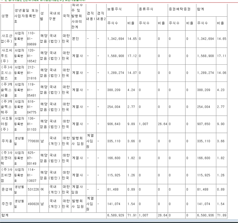 사조대림의 지난 21일 기준 최대주주및 특수관계인 명단