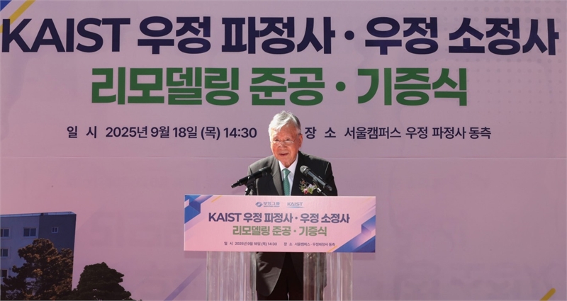 이중근 부영그룹 회장이 18일 KAIST 우정 소정사·우정 파정사 리모델링 준공·기증식에서 기념사를 하고 있다.[사진=부영그룹 제공]