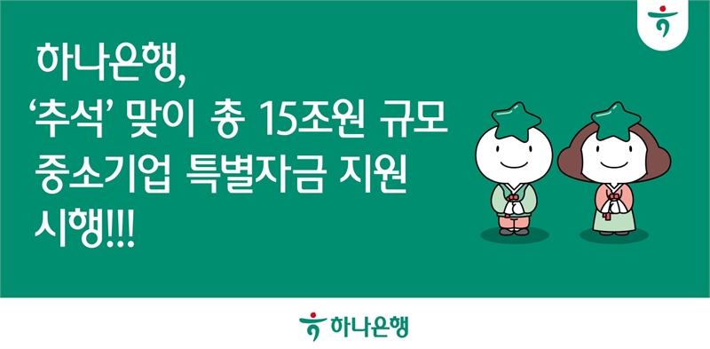 하나은행은 추석 명절 전후 자금 수요가 많은 중소기업에게 오는 24일까지 총 15조원 규모의 특별자금 지원을 실시한다고 1일 밝혔다.
