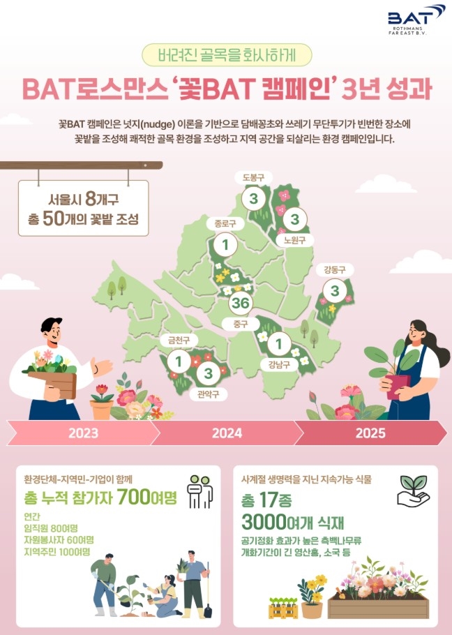 꽃BAT 캠페인은 BAT로스만스의 대표적인 지속가능 환경 캠페인 중 하나다. 상습 쓰레기 및 담배꽁초 무단투기 구역에 꽃과 나무를 심어 무단투기를 줄이고 지역 환경을 개선하는 프로젝트다. 넛지 이론을 적용해 사람들의 선택을 강요하는 대신 자연스러운 행동 변화를 유도하며 생활 속 ESG 실천 모델로 자리잡고 있다.