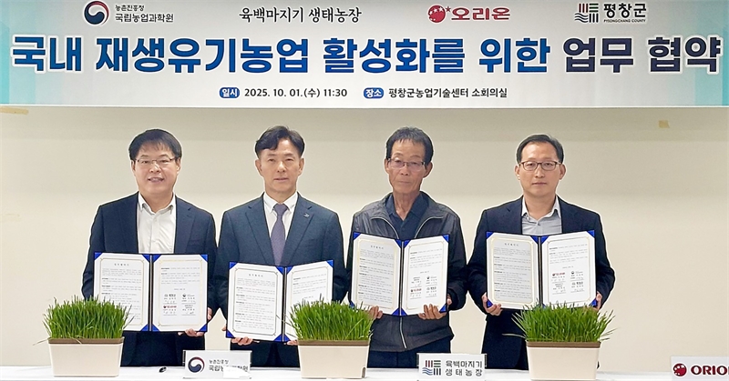 오리온은 농촌진흥청 국립농업과학원, 강원도 평창군청, 육백마지기 생태농장과 ‘국내 재생유기농업 확산 기반 조성을 위한 업무협약’을 체결했다고 1일 밝혔다.