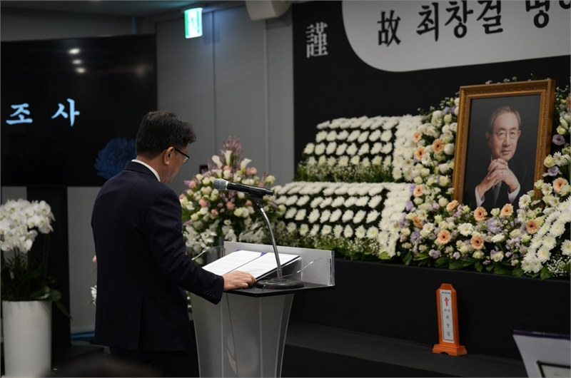 10일 서울 종로구 고려아연 본사에서 진행된 고(故) 최창걸 고려아연 명예회장 영결식에서 이제중 고려아연 부회장이 조사를 낭동하고 있다.[사진=고려아연 제공]