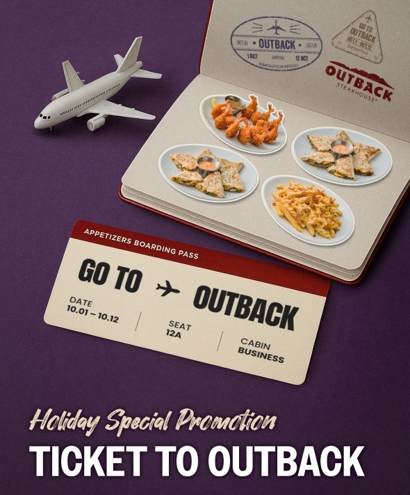 다이닝브랜즈그룹은 캐주얼 다이닝 레스토랑 아웃백 스테이크하우스가 매장을 방문해 항공권을 제시하는 고객을 대상으로 애피타이저 무료 제공 프로모션 ‘티켓 투 아웃백’을 진행한다고 13일 밝혔다.