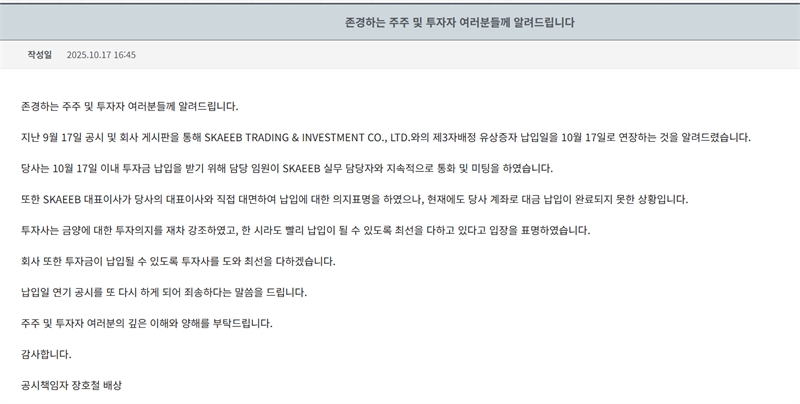 연기될 때 마다 매번 홈페이지에 사과문을 공지하던 금양은 이번에도 비슷한 사과문을 또 올렸다. 17일자 사과문에서 금양은 “당사는 10월17일 이내 투자금 납입을 받기 위해 담당 임원이 SKAEEB(사우디기업) 실무 담당자와 지속적으로 통화 및 미팅을 했으며, 또 SKAEEB 대표이사가 당사의 대표이사와 직접 대면해 납입에 대한 의지표명을 했으나 현재에도 당사 계좌로 대금 납입이 완료되지 못한 상황”이라고 밝혔다.