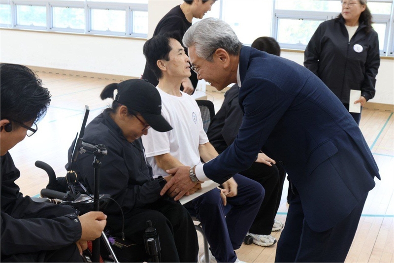 김영길 우미건설 대표가 '제45회 전국장애인체전' 결단식에 참석해 선수들을 격려하고 있다.[사진=우미건설 제공]