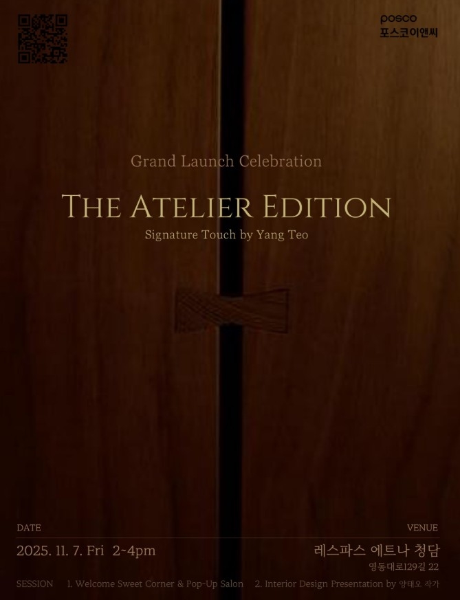 포스코이앤씨는 세계적인 인테리어 디자이너 양태오 작가와 함께 개발한 하이엔드 인테리어 상품 ‘아틀리에 에디션’을 다음달 7일 서울 레스파스 에트나 청담에서 런칭 행사를 열고 공식 공개한다고 20일 밝혔다.