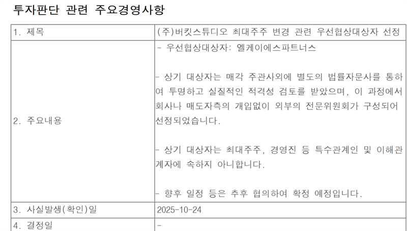 버킷스튜디오는 경영권 공개 매각을 위한 최대주주 변경과 관련, 우선협상대상자로 엘케이에스파트너스를 선정했다고 24일 공시했다.