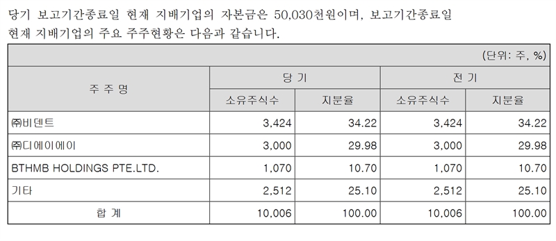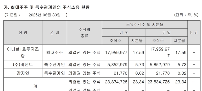 지난 6월 말 기준 버킷스튜디오의 최대주주는 이니셜1호투자조합(17.59%)이며 비덴트와 강지연 대표도 각각 5.73%, 0.02%씩 지분을 갖고있다. 또 이니셜1호투자조합의 최대주주(51%)는 이니셜이고, 이니셜의 최대주주는 강지연 버킷스튜디오 대표로 지분 100%를 갖고있다. 소액주주들 지분은 67.7%다.