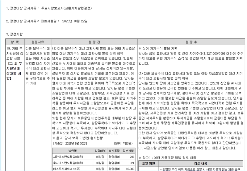 이에 테스는 28일 정정 공시를 다시 내고 잔여 자사주 활용계획, 기타 자금조달 방법 검토내용, 금융기관 차입금 현황, 타법인 출자현황, EB 조달자금 사용계획 등을 자세히 설명했다. 이 정정 공시에 금감원이 만족할 지는 지켜볼 일이다.