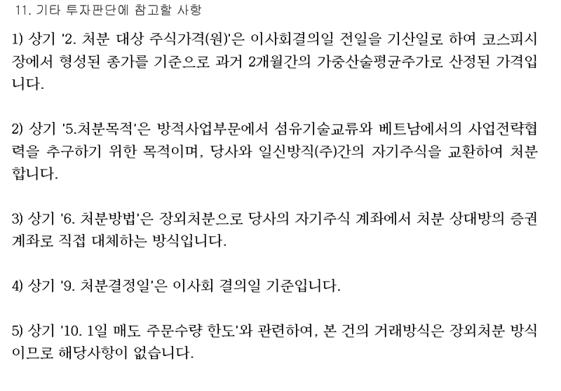 이 맞교환 처분 전 경방은 9.12%, 일신방직은 7.7%의 자사주를 각각 보유 중이었다. 자사주 량으로는 적지 않은 편들이다.
