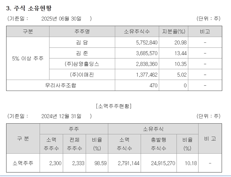 경영권분쟁 등을 우려하기엔 아주 안정적인 지분구조다. 지금까지 가족간 경영권 분쟁 같은 것도 전혀 없었다. 김 담-김 준 양 대표는 형제 간이다.