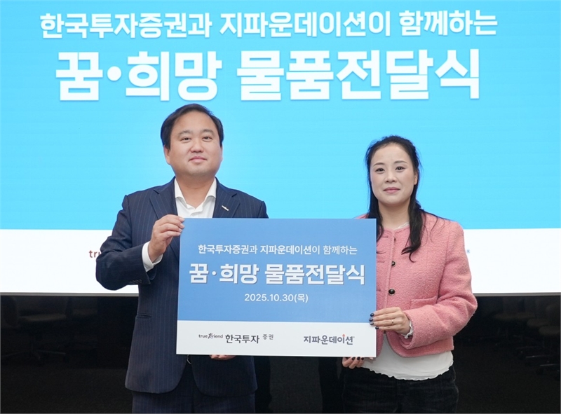 30일 한국투자증권 본사에서 열린 물품 전달식에서 오석진 한국투자증권 홍보실장(왼쪽)과 정지민 지파운데이션 대외협력팀장이 기념촬영을 하고 있다.[사진=한국투자증권 제공]