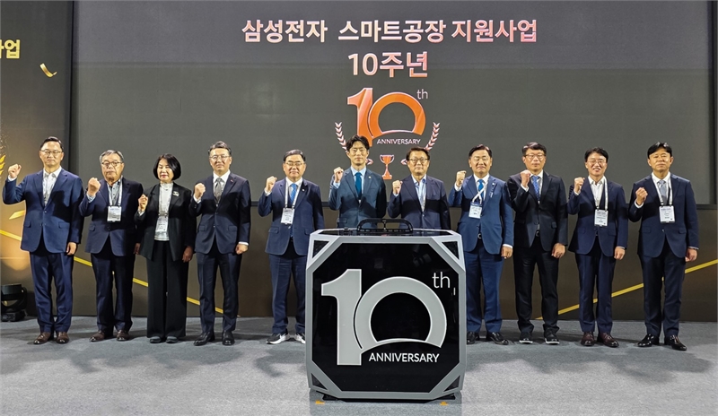 지난 21일 서울 삼성동 코엑스에서 개최된 '삼성 스마트공장 지원사업 10주년 기념행사'에서 참석자들이 기념 촬영을 하고 있다.[사진=삼성전자 제공]
