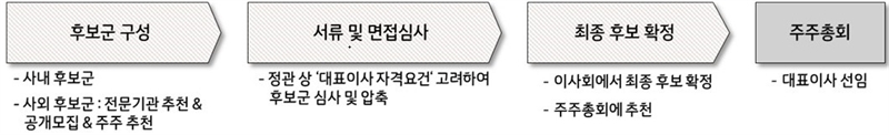 이사후보추천위원회는 △외부 전문기관 추천 △공개 모집 △주주 추천(전체 주식의 0.5% 이상 6개월 이상 보유 주주) △관련 규정에 따른 사내 후보로 대표이사 후보군을 구성할 예정이다.