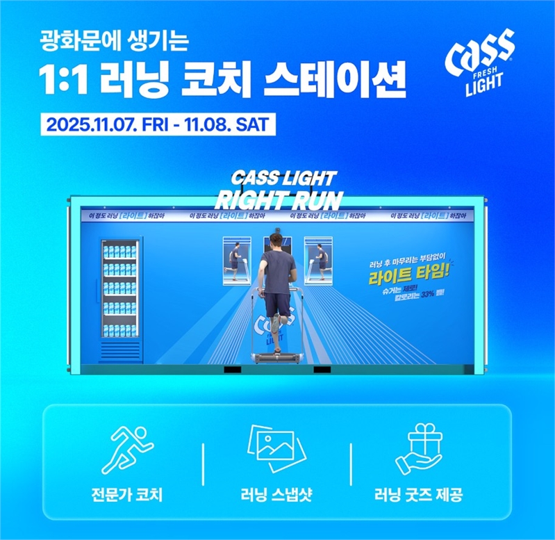 CU 반포점·이촌점 진입 동선에 마라톤 결승 지점을 연상시키는 구조물을 설치하고, 매장 내부 바닥에는 러닝 트랙 디자인을 적용해 실제 완주 지점에 도착한 듯한 분위기를 구현했다. 이에 더해 ‘끝까지 달렸다면, 마무리는 라이트하게!’ 등 운동 후 가볍게 즐길 수 있는 카스 라이트만의 ‘라이트함’을 강조하는 문구를 매장 내 곳곳에서 찾아볼 수 있도록 했다.