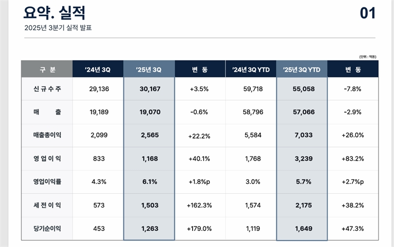 상당수 건설사들이 아직 고전 중인 가운데 DL이앤씨는 3분기(7~9월)에 상당히 호전된 영업실적을 보였다.