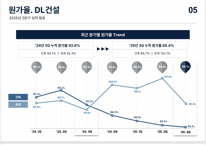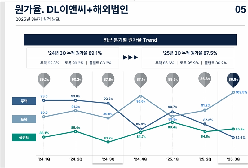 이날 실적발표 설명자료에 따르면 실제 DL이앤씨(별도기준)의 주택부문 분기별 원가율은 작년 1분기에만 해도 93%에 달했던 것이 올 3분기에는 82.6%까지 떨어졌다. 같은 기간 자회사 DL건설의 건축부문 원가율도 93.3%에서 84.5%까지 하락했다. 원가 절감에 총력을 다한 결과라고 볼 수 있다.