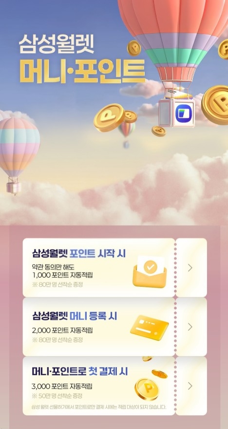 해당 이벤트는 삼성월렛 머니·포인트에서 △약관 동의 시 1000 포인트 △머니 등록 완료 시 2000 포인트를 받을 수 있어 최대 3000 포인트를 현금처럼 사용할 수 있다.