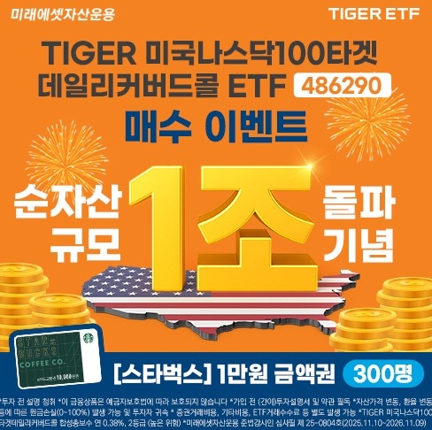 미래에셋자산운용은 ‘TIGER 미국나스닥100타겟데일리커버드콜 ETF’ 순자산이 1조원을 돌파했다고 11일 밝혔다.
