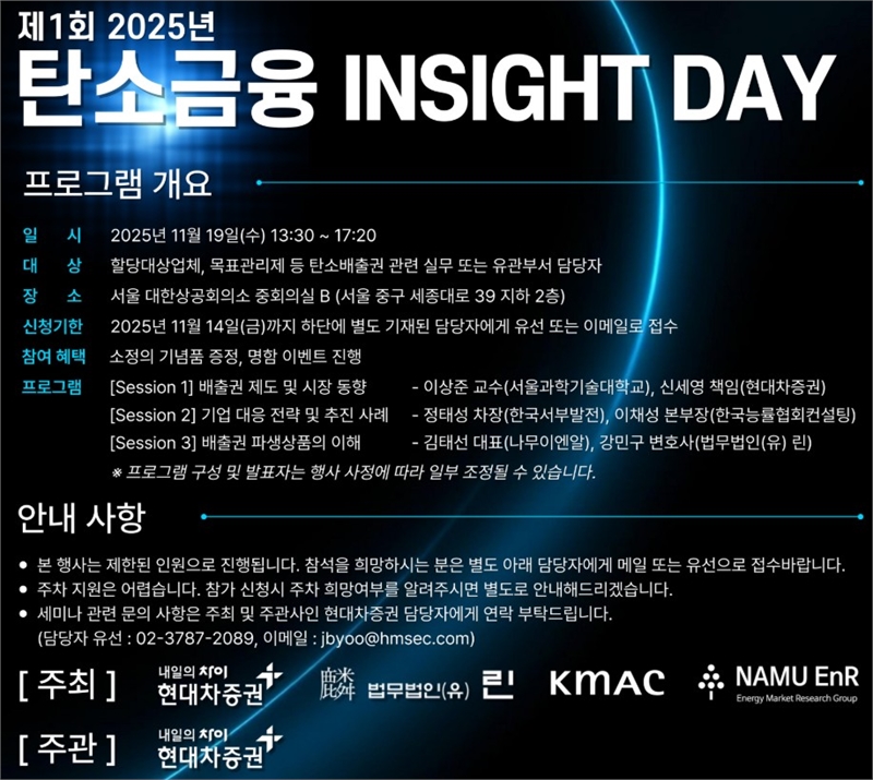 현대차증권은 탄소금융 분야 최신 동향과 인사이트를 공유하기 위해 유관 기업 및 기관의 전문가들이 함께하는 ‘제1회 2025 탄소금융 인사이트 데이’를 오는 19일 개최한다고 12일 밝혔다.