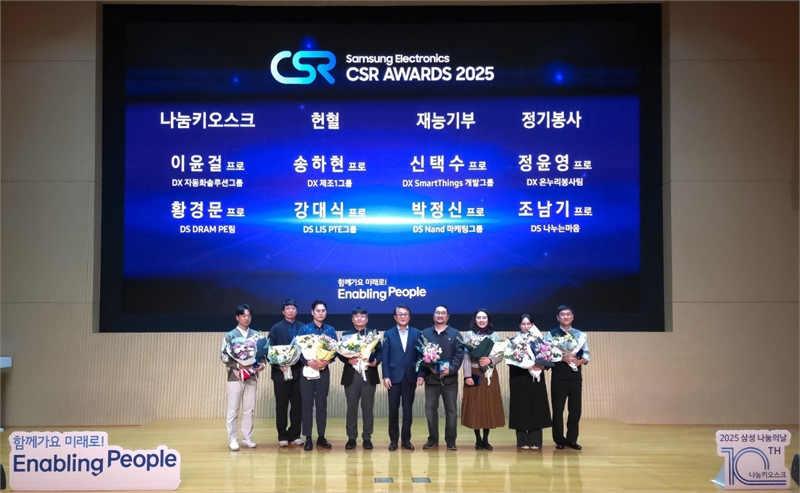 13일 열린 '2025 삼성 나눔의 날' 행사에서 박승희 CR담당 사장(가운데)이 올해 우수 봉사·기부자로 선정된 임직원들에게 'CSR 어워즈'를 시상한 뒤 함께 기념촬영을 하고 있다.[사진=삼성전자 제공]
