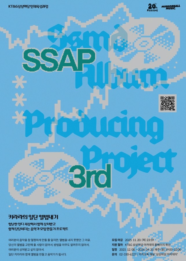 KT&G 상상마당은 국내 신진 뮤지션들의 음반 제작을 지원하고자 ‘SSAP) 3기’ 수강생을 오는 20일까지 모집한다고 14일 밝혔다.