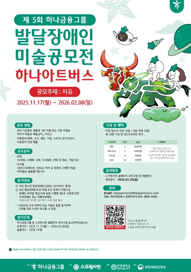 이번에 개최하는 제5회 하나 아트버스는 내년 2월 8일까지 하나금융 공식 홈페이지를 통해 온라인으로 접수할 수 있다.