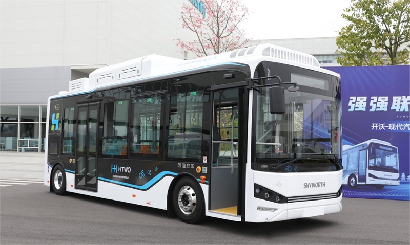 HTWO 광저우와 카이워그룹이 공동 개발한 8.5m 수소연료전지버스.[사진=현대차·기아 제공]