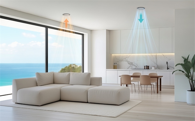 집 안 곳곳에 설치된 천장형 공기 출입구 디퓨저는 거실·주방·서재 등 공간별 오염도에 따라 자동으로 열리고 닫히며 필요한 공간에 집중 환기한다.