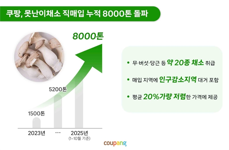 쿠팡은 최근 3년간 전국 농가에서 직매입해 새벽배송으로 선보인 ‘못난이 채소’ 누적 규모가 8000톤을 돌파했다고 18일 밝혔다.