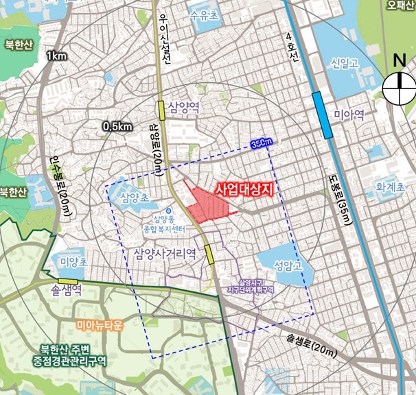 이 사업은 서울 강북구 미아동 754번지 일대 총 1만7716㎡ 부지에 지하 4층~지상 38층, 630가구 규모의 아파트 단지를 조성하는 도시정비형 재개발사업이다. 우이신설선 삼양사거리역을 도보로 이용할 수 있다.