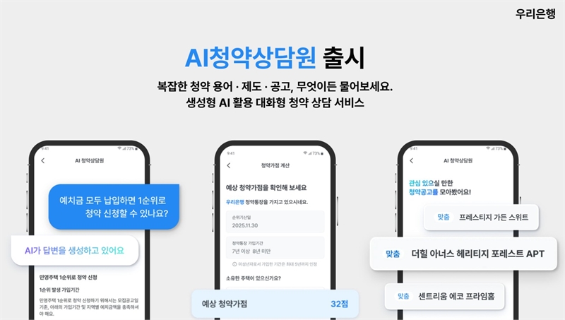 우리은행 관계자는 “우리은행이 청약의 모든 궁금증을 해결할 수 있는 대표 채널로 인식될 수 있도록, 정확하고 체계적인 청약 상담을 제공하는 것이 목표”라며 “AI 기술을 통해 업계를 선도하는 상담 경험을 만들겠다”고 말했다.