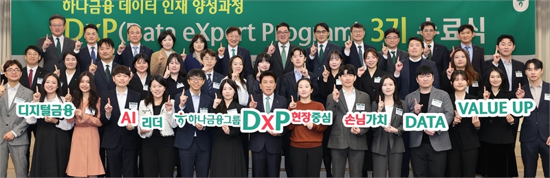 하나금융그룹은 지난 25일 명동사옥에서 그룹 공동의 '하나 DxP 과정' 3기 수료식과 함께, 데이터 인재 양성의 새로운 목표인 ‘3000 by 2027’을 수립했다고 26일 밝혔다.