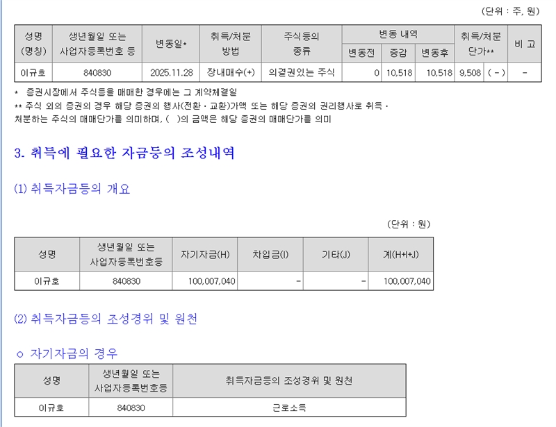 이규호 부회장의 코오롱글로벌 지분 장내매수 공시