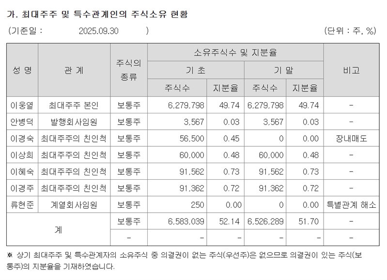 지주사 코오롱의 지난 9월말기준 최대주주및 특수관계인 현황