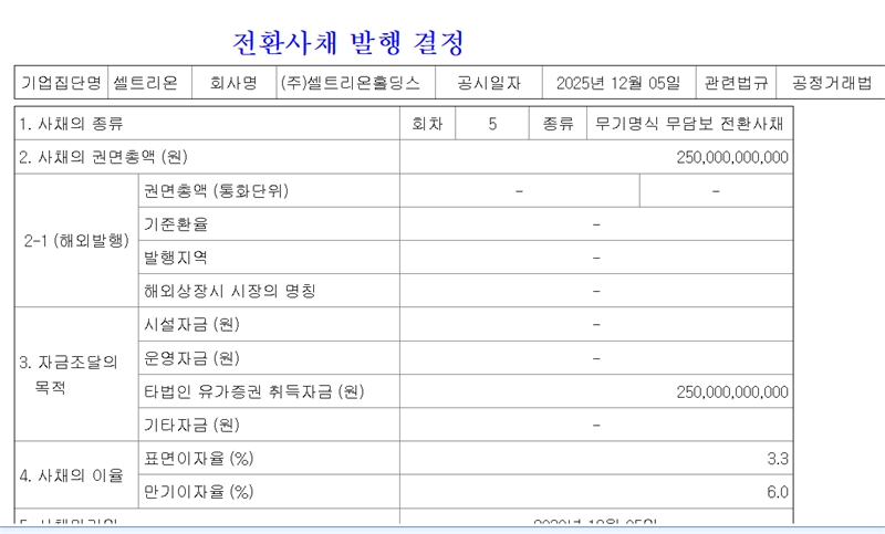 셀트리온홀딩스는 5일 공시를 통해 제5회 사모전환사채(CB) 2500억원을 발행한다고 밝혔다. 청약 및 납입일은 5일, 만기는 2030년이며, 사채 매입자의 주식전환 청구는 1년 후부터 가능하다.