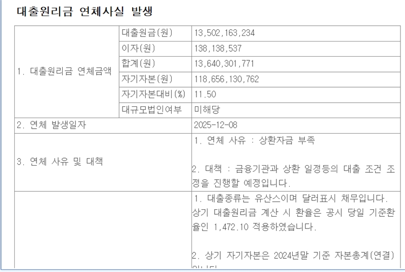 공시에 따르면 연체된 대출 원금은 135억원, 이자 1.38억원 등 합쳐 136.4억원이다. 이 회사 자기자본의 11.5% 규모다. 연체 사유는 상환자금 부족 때문이며, 연체 대책으로는 금융기관(산업은행)과 상환 일정 등의 대출조건 조정을 진행할 예정이라고 밝혔다.
