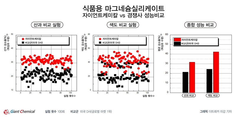 자이언트케미칼 vs 미국 D사, 마그네슘 실리케이트 성능비교 실험. ⓒ그래픽=더트래커/이강 기자