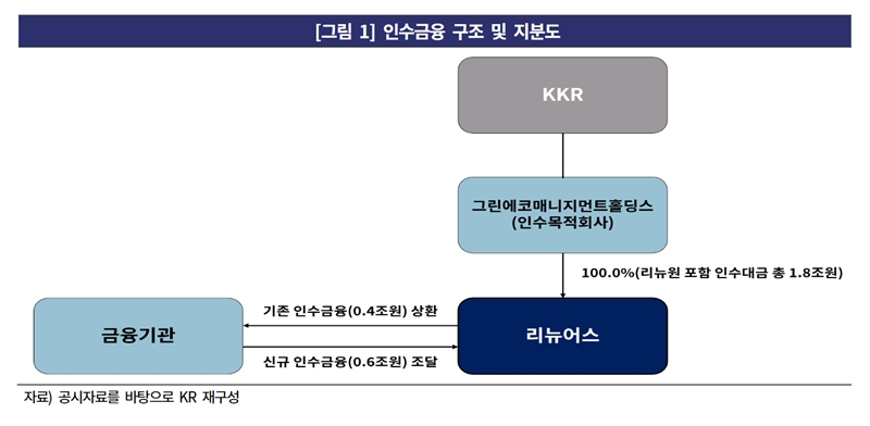 총 인수대금 1.8조원(리뉴원 포함) 중 리뉴어스 인수금융 차입금 5800억원, 리뉴원 인수금융 차입금 1500억원 및 매립장 증설시 지급해야하는 금액을 제외한 잔여분을 KKR이 조달한 것으로 추정된다. 인수대금 중 인수금융 비중은 절반 가량인 9천억원 안팎으로 업계는 보고있다.