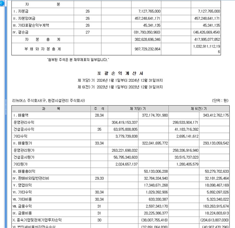 리뉴어스의 2024년 재무상태표 및 손익계산서 일부