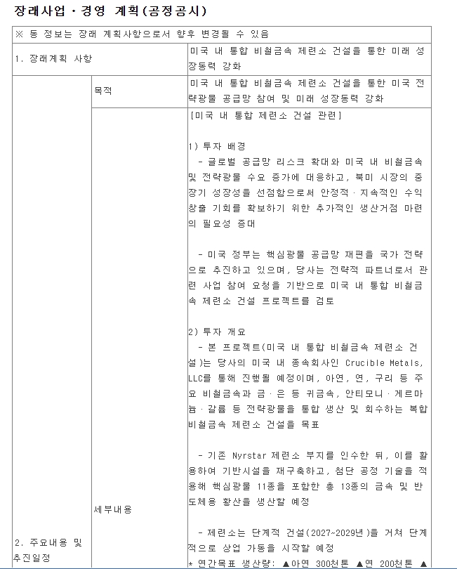 공시에 따르면 미국 내 통합 비철금속 제련소 건설 및 운용은 고려아연이 미국내에 새로 만들 손자회사 Crucible Metals, LLC(이하 제련소운영법인)를 통해 진행된다. 아연, 연, 구리 등 주요 비철금속과 금·은 등 귀금속, 안티모니·게르마늄·갈륨 등 전략광물을 통합 생산 및 회수하는 복합 비철금속 제련소다.