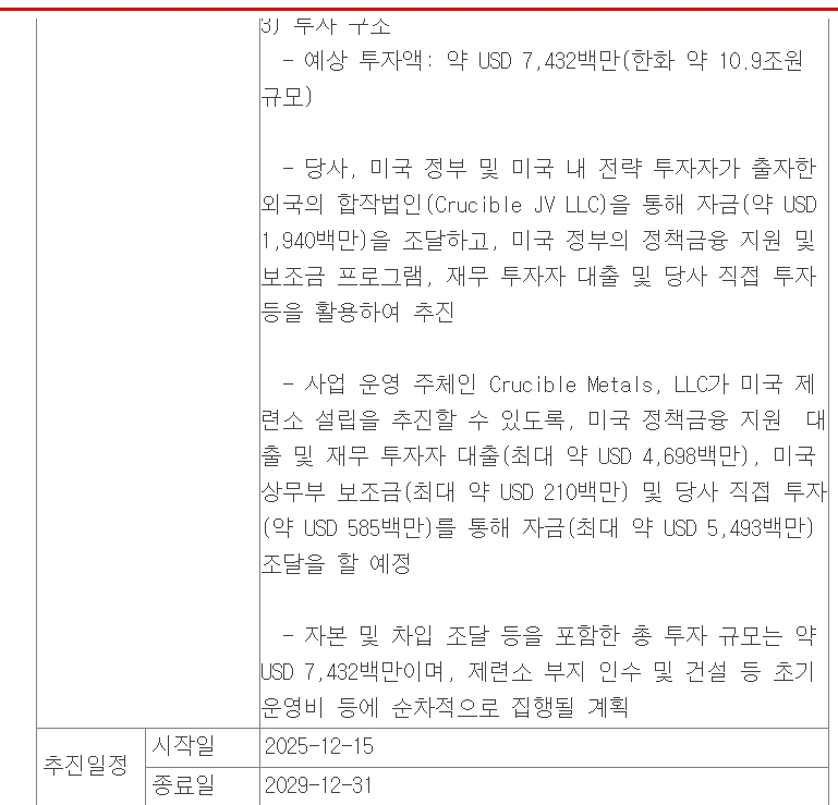 예상되는 총 투자액은 74억3200만달러(한화 약 10.9조원) 규모다. 고려아연과 미국 정부 및 미국내 전략투자자가 출자한 합작법인 Crucible JV LLC(이하 합작법인)를 통해 19.4억달러를 조달하고 미국 정부의 정책금융 지원 및 보조금 프로그램, 재무적 투자자 대출 및 고려아연 직접 투자 등도 활용해 추진한다.